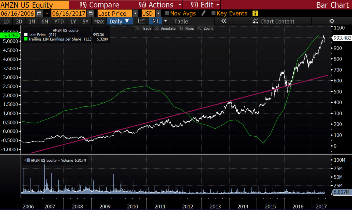 What is absurd, however, is that few could have envisioned the utter dominance Amazon was to have across retail and data service sectors, not to mention its popularity in the capital markets. While it was clear that the internet would revolutionize much of the retail world, in 2006 Amazon was still best known for books, not apparel, electronics, entertainment, cloud storage, or web hosting. The evolution of its offerings was hardly predictable. Eleven years later, it is now selling for 186 times earnings.